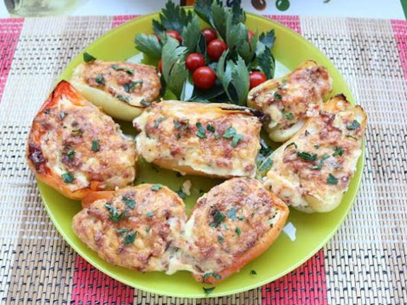Paprike oprati i preseći na pola izvaditi seme. Sir izdrobiti dodati jaje i rendanu šunku i čajnu.