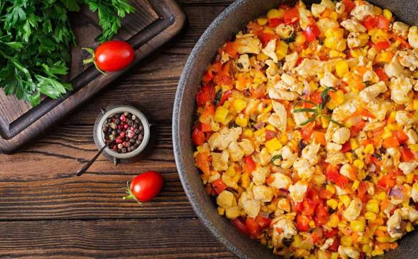 Proprženi luk i papriku sklonite sa ringle. Prelijte mlince provrlom supicom, posle 2-3 minuta ocedite. Pasulj isperite pod hladnom vodom, dodajte na papriku i luk. Kukuruz i grašak samo ocedite, pa dodajte na pasulj. Svemu dodajte i paradajz. Ako je paradajz u komadu, malo ga izdrobite varjačom.