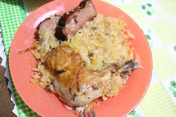 U kupus dodati sve nabrojene sastojke, dodati malo vode i krčkati na laganoj vatri. Kad voda ispari, prebaciti u pleh i staviti u rernu da se lepo zapeče oko 30 min.