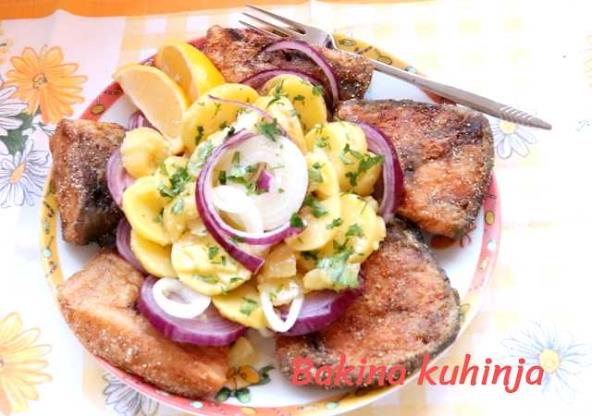 Krompir skuvati u ljusci očistiti i iseći. Posoliti dodati sirćeta, ulja, bibera peršunovog lista i sve izmešati. Služiti uz ribu kao prilog.
