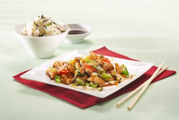 Na tanjire slažemo rezance u umaku, a preko pečene komadiće svinjetine. Tanjir ukrasimo sa zelenim delom mladog luka i klicama belog luka.