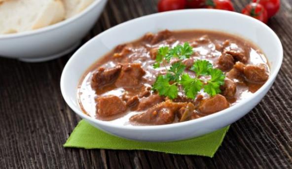 3. Dodajte vode po potrebi i dinstajte dok meso sasvim ne omekša. Poprašite paprikom i brašnom, začinite solju i biberom i još kratko dinstajte.