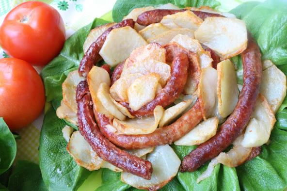 Tepsiju premazati uljem, kobasicu staviti u sredinu, a između poređati krompir.
