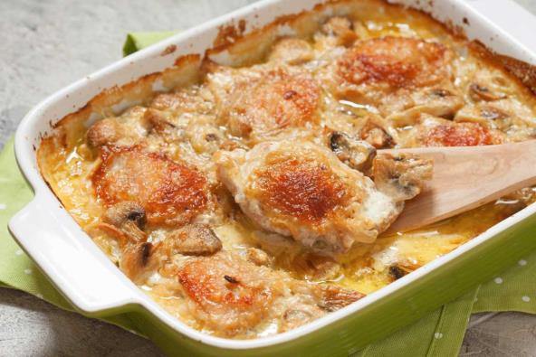 U vatrostalnu posudu poređajte iseckanu piletinu, zatim pospite supom iz kesice i prelijte pavlakom za kuvanje. Stavite u rernu na 200 °C i pecite dok ne porumeni.