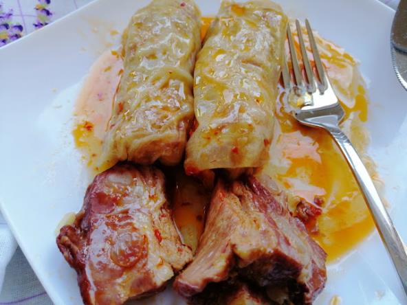 U sredinu staviti nasečena rebra i nasečenu sredinu kupusa. Dodati lovorov list neko zrno bibera i veću kašiku masti. Posuti još malo paprikom i tucanom paprikom i naliti vodom da ogrezne.