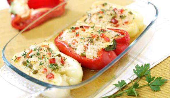 2. Paprike isecite na polovine po dužini, pa im odstranite semenke. Jednu papriku iseckajte i pomešajte s maslinama i paradajzom, pa dodajte skuvanom pirinču koji je u potpunosti upio tečnost u kojoj se kuvao. To je masa kojom ćete puniti paprike i poređati ih u podmazan pleh.
