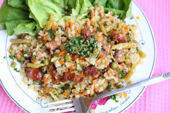 Na ulju propržiti seckan luk, dodati sečene domaće kobasice, seckanu šargarepu, sve dinstati dodati grašak i boraniju pa dinstati oko 20 min.