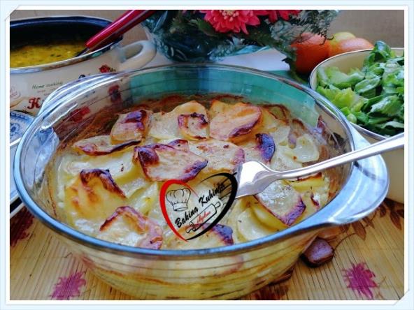 Vatrostalnu činiju podmazati četkicom sa uljem, pa poređati pola krompira.