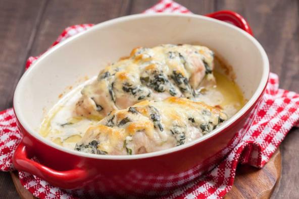 Keramičku posudu poprskamo uljem i stavimo pola od prethodno opranih listova spanaća. Pola sadržine iz tiganja nanesemo u keramičku posudu. Potom preko stavimo preostale listove spanaća, pa preostalu sadržinu iz tiganja dodamo u posudu.