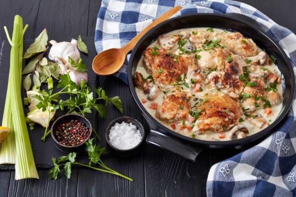 Sastojci za 4 osobe: 450 g pilećih grudi (bez kostiju), 100 g brašna, 2 limuna, 2 kašičice ekstra devičanskog maslinovog ulja, 100 ml pileće supe, 2 kašičice putera, 2 belog luka, 1 kašičica soli, 1 kašičica bibera, sveži peršun