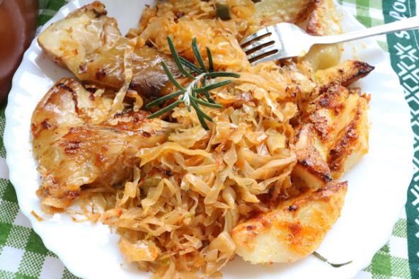 Kad je kupus izdinstan ribu izvaditi iz marinade pa marinadu dodati u kupus, izmešati dobro a ribu poređati na kupus malo pritisnuti i peći u rerni oko 45 do 50 min na 250 stepeni. Može se pokriti folijom..