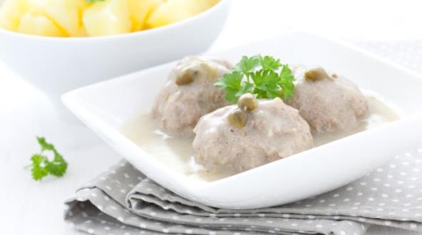 2. Za sos otopite maslac, na njemu propržite brašno, pa dodajte vodu i prokuvajte. Začinite inćunima, kaprima, sirćetom, solju i biberom. Polako u sos stavljajte ćufte i kuvajte ih 15-20 minuta.