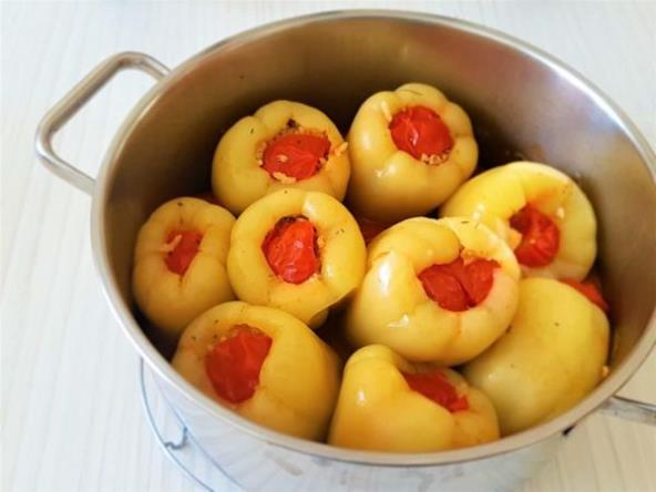 Dodajte začine po ukusu, malo bosiljka i pripremljenom smesom napunite paprike.