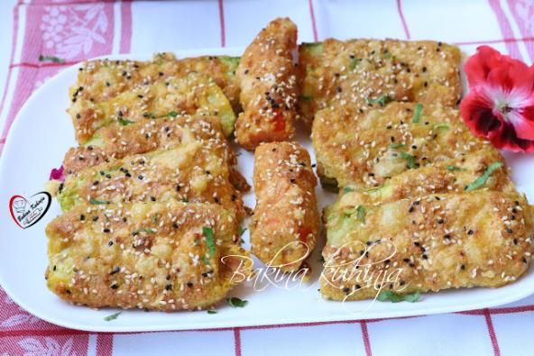 Tikvice iseći na tanke listove i posoliti. Ostaviti 15-20 minuta da odstoji pa iscediti tečnost. Razlupati jaja u činiju žicom. U posebnu činiju sipati prezle, brašno, griz, pola susama i mlevenu papriku malo. Sve izmešati.