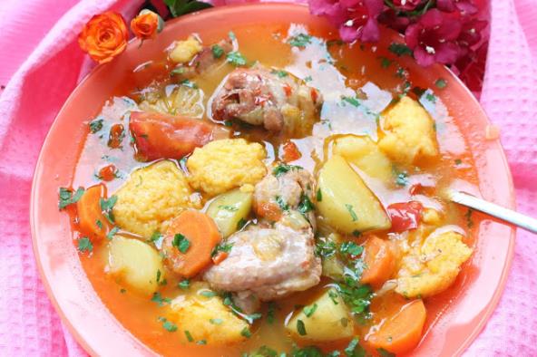 Na ulju propržiti sitno seckan luk, dodati seckanu svežu papriku, na kolutove šargarepu, seckan mlad kupus, pa dodati meso, mlad krompir, crvenu mlevenu papriku, beli luk, biber u zrnu, lovorov list i dodati malo vode i prodinstati. Dodati i ljutu mladu papričicu. Kad se meso i krompir skuva dodati kašiku ajvara, malo suvog biljnog začina i soli. Napraviti knedle sa jajetom, brašnom grizom i malo ulja. Vaditi kašičicom... i kuvati par minuta da knedle omekanu. Dodati mlevenog bibera i peršunovog lista. Naš ručak je gotov... Prijatno!!