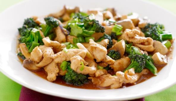 3. Na zagrejane dve kašike ulja pržiti meso četiri minute, pa ga izvaditi. Drške brokolija izdinstati, dodati ružice, pa dinstati još dva minuta. Dodati pečurke, crni luk i peći još četiri minuta. Naliti mešavinom preliva i prokuvati. Dodati meso i orahe, pa zagrejati. Posoliti i pobiberiti po ukusu.