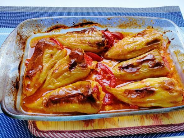 Paprike oprati i izvaditi seme. Sir izdrobiti, dodati jaje, griz, seckanu šunku, seckane maslinke i začine po želji. Sve izjednačiti i puniti paprike, pa zatvoriti kolutovima paradajza. Tepsiju podmazati uljem i poređati paprike. Premazati ih uljem i dodati malo kuvanog paradajza oko 100 ml.