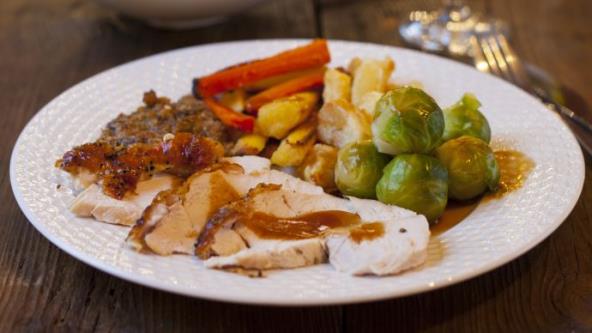 4. Temperaturu povisiti na 220 stepeni. Meso peći još 15 minuta. Pritom povremeno prelivati preostalim pivom. Meso i povrće izvaditi iz pleha i ostaviti na toplom mestu. Sos od pečenja u šerpici još malo kuvati i začiniti limunovim sokom, krupnim šećerom, i kajen biberom. Pečenje iseći i servirati sa povrćem i sosom.
