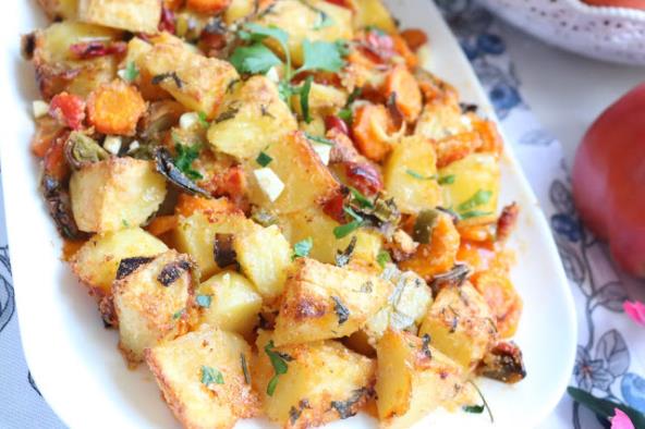 Krompir očistiti, oprati i iseći na krupnije kocke. Dodati šargarepu isečenu na kolutove, praziluk na kolutove, papriku sečenu, beli luk.