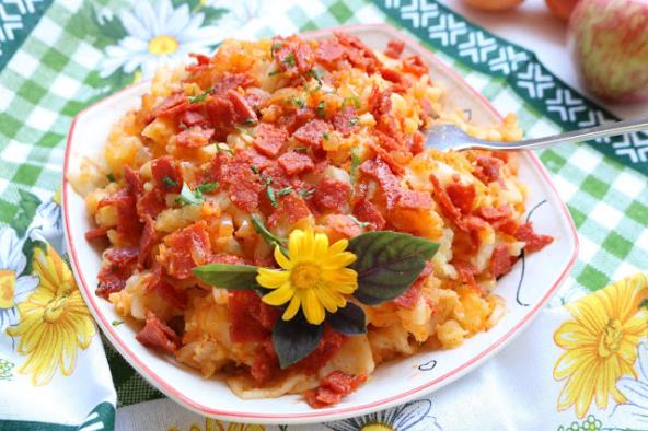 Testeninu skuvati. Krompir skuvati pa izgnječiti. Luk sitno iseckati i propržiti na ulju..Dodati kašičicu mlevene paprike i malo bibera. Sve izmešati i posoliti. po želji možete dodati i malo pržene sitno seckane kobasice koju ćete staviti odozgo...Postupak pripreme pogledajte u VIDEU.