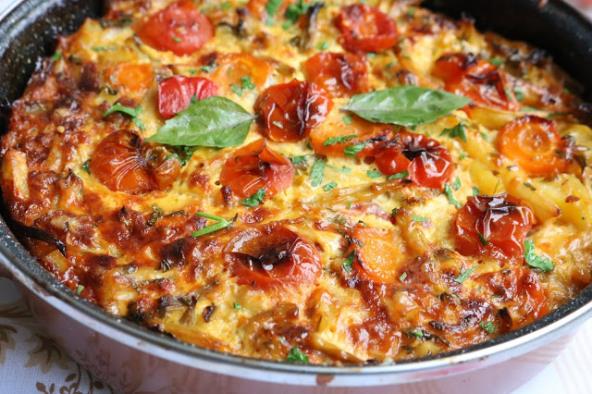 Ubaciti na sitne kockice krompir. Razlupati jaja, umutiti dodati mlevenu papriku, seckan beli luk, mleko, suvi začin ili so i sve dobro izmešati.