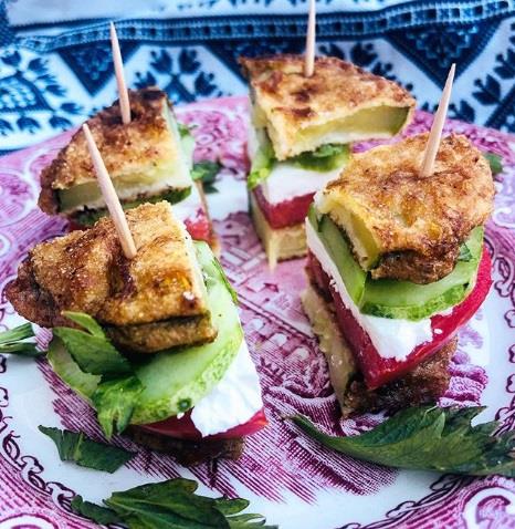 Tikvice iseći na kolutove, posoliti i ostaviti da se ocede. 2/3 projinog brašna pomešati sa 1/3 belog i tikvice uvaljati u mešavinu, a zatim i u jaja. Pržiti na ulju sa obe strane. Između dve pohovane tikvice poređati sir, paradajz i krastavac. Zabosti 4 čačkalice i iseći na četvrtine.