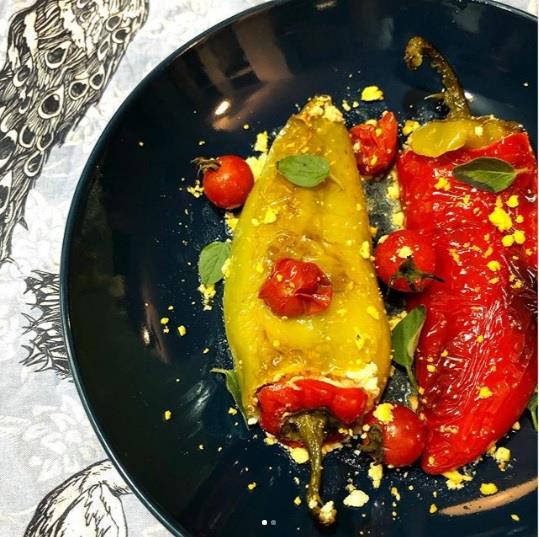 Paprikama odseći peteljku i očistiti ih od semenki. Napuniti ih smesom od sira i pržiti kratko sa svih strana u ulju, poklopljene. Pred kraj dodati čeri.