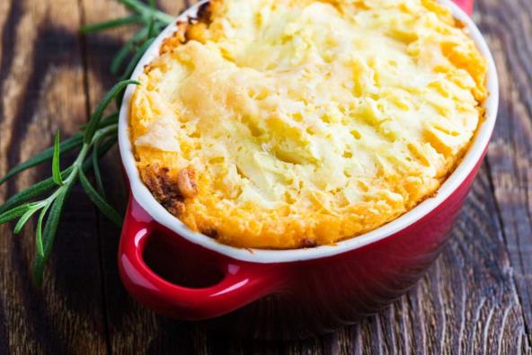 Ispecite piletinu ili naseckajte pileće pečenje. Ogulite krompir, narežite ih na kockice i kuvajte u posoljenoj vodi dok ne omekšaju. Još vruć krompir usitnite drobilicom za pire dodajući malo mleka i maslaca. Meso od pilećeg pečenja sitno naseckajte. Luk očistite i prepržite na malo maslaca, dodajte brašno, pržite još nekoliko minuta te zalijte supom i sokom od pečenja. Dodajte kockice šargarepe i oceđeni grašak. Posolite, pobiberite, dodajte seckani peršun i mlevenu papriku, pa kuvajte nekoliko minuta. Umešajte komadiće sitno seckanog pilećeg mesa i ostavite na vatri samo da se dobro zagreje. Zagrejte pećnicu na 220°C. Dublju posudu za pečenje premažite maslacem i obložite šoljicom pasiranog krompira. Posložite po njemu meso sa sokom te prekrijte preostalim krompirom. Umutite žumanca i prelijte ih po smesi od krompira. Stavite pitu u dobro zagrejanu rernu dok se krompir na vrhu ne zapeče.