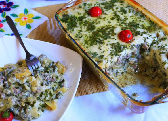 Sitno iseckan luk ispržite na malo ulja, dodajte mleveno meso i kratko dinstajte. Dodajte mleko, iseckan spanać i peršunovo lišće. Posolite, pobiberite i čim prokuva sklonite sa ringle. Posebno izmešajte pavlaku, brašno i malo mleka, pa umešajte u meso i spanać. Krompir očistite i isecite na šnite, stavite u vatrostalnu činiju ili tepsiju. Začinite suvim začinom ili samo posolite, pa poravnajte.