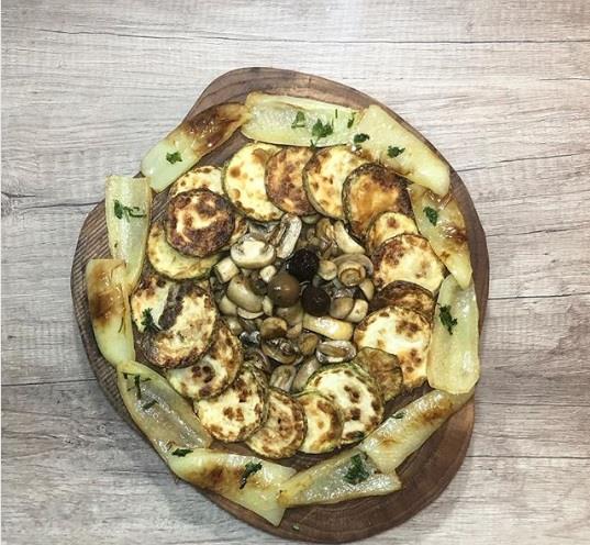 Tikvicu iseći na kolutove, posoliti i ostaviti da se ocedi. Zatim uvaljati u brašno i propržiti. Papriku iseći na deblje trake, posoliti i propržiti. Isto i sa pečurkama, iseckati ih, posoliti i propržiti.