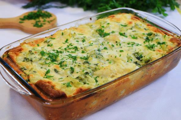 Karfiol operite, isecite na krupne cvetove i obarite u slanoj vodi zajedno sa listovima. Ne treba da bude skroz mekan, procedite. Istresite u podmazanu tepsiju ili vatrostalnu posudu, iseckajte skuvane listove pa i njih dodajte.Umutite jaja sa pavlakom, mlekom, uljem. Dodajte brašno i prezle, začine, dobro promešajte i istresite preko karfiola. Pecite u već zagrejanoj rerni na 200 stepeni oko 30 minuta. Pred kraj sklonite foliju ili poklopac pa kratko zapecite da dobije boju. Prijatno!