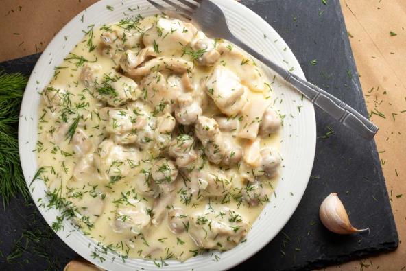 Piletinu, luk i pečurke iseckajte. Zagrejte malo ulja u dubljem tiganju, pa propržite meso. Zatim ga prebacite u drugu posudu, a u tiganj dodajte luk i pečurke i još malo ulja. Začinite i dodajte piletinu. Promešajte, pa dodajte vodu. Zatim poklopite i ostavite da se krčka neko vreme. Od brašna i vode napravite zapršku i dodajte u jelo. Zatim dodajte neutralnu pavlaku, promešajte, pa dodajte običnu pavlaku.