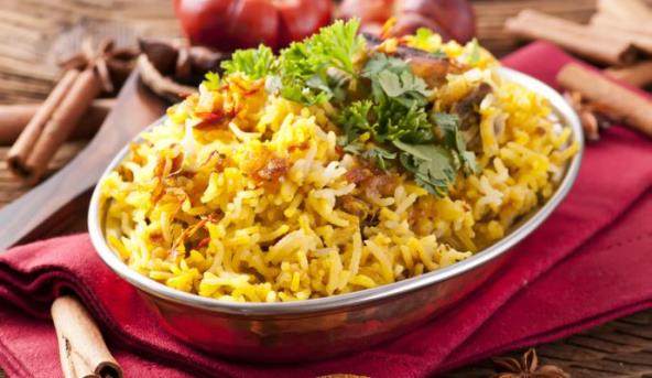 600g pilećeg belog mesa 3 kašike palminog ulja 1 glavica iseckanog crnog luka 150g pirinča 2 češnja belog luka 1 šolja sečenog paradajza iz konzerve 1 list lorbera 1 kafena kašičica majčine dušice