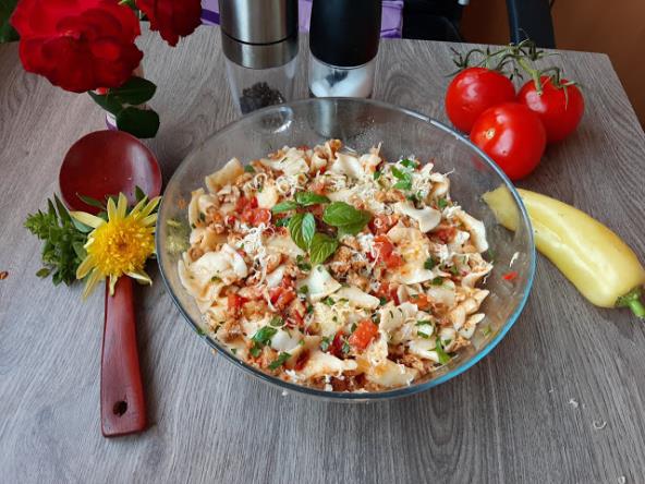 Skuvati testeninu, a luk sitno iseckati, pa propržiti na ulju. Dodati seckanu zelenu papriku. Kada se sve to malo proprži dodati mleveno meso. Dinstati 20 min., pa ubaciti paradajz na kockice, seckan beli luk, crvenu papriku i tucanu ljutu. Na kraju ubaciti začine. Testeninu procediti, pa izmešati sa prženim mlevernim mesom. Odozgo narendati kačkavalj.