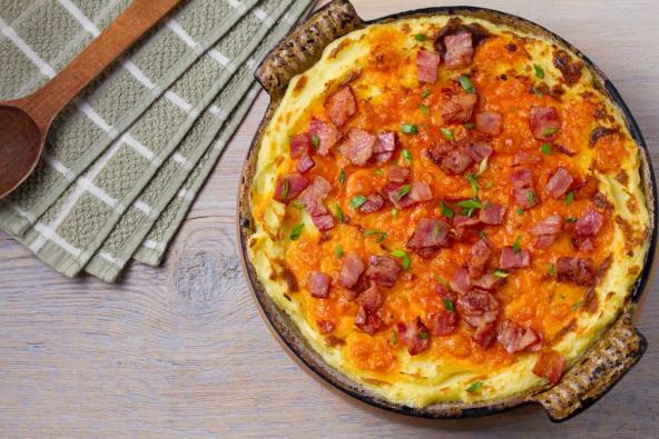 Prodinstajte na ulju sitno seckanu šargarepu, papriku i luk. Dodajte meso, utrljajte ga viljuškom da bude u mrvicama. Dodajte oljušteni i na kockice nasečeni krompir, mlevenu papriku i so. Stavite sve u tepsiju sa jednom šoljom vode. Pecite na 180 stepeni oko 50 minuta. Prelijte sve umućenim jajima sa kiselim mlekom, koje ste začinili sa malo soli i bibera i zapecite još 10 minuta na 200 stepeni, pa na vrelu musaku pospite malo seckane, propržene slanine.