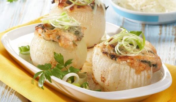 1. Skinuti ljusku s luka i odseći kapice. Izdubiti kašicicom, da ostane zidić debeo oko pola centimetra. Iseckati izdubljenu sadržinu luka. Ono što je ostalo kao posudica za punjenje kuvati u ključaloj slanoj vodi oko 2 minuta, pa procediti i ostaviti na rešetki da se dobro ocedi.