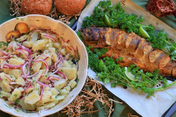 Recept za najednostavniju krompir salatu koja najbolje ide uz ribu, i naravno recept za ukusnu ribu iz rerne.