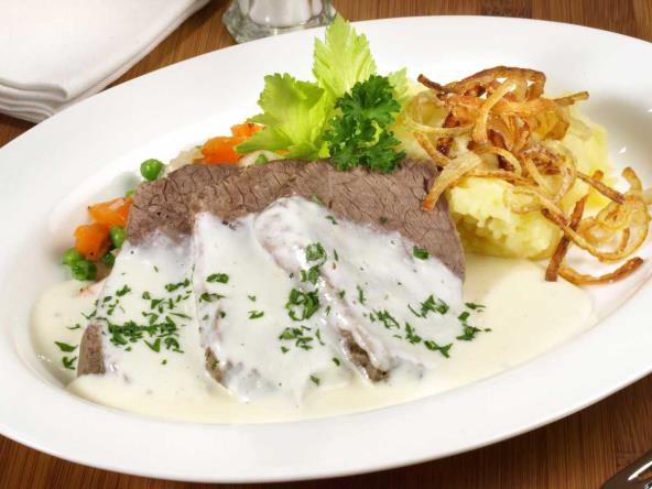 Meso staviti u vruću vodu (bice sočnije), dodati očišćeno i isečeno povrće, biber, list celera i suvi biljni začin. Kuvati na laganoj vatri oko 2 sata i po želji dosoliti. U posebnom sudu sipati kiselu pavlaku i ren i malo prokuvati, dodati sok od limuna i vodu i kuvati 5 minuta. Kuvano meso izvaditi, iseći i poslužiti sa kuvanim povrćem i sosom od rena.