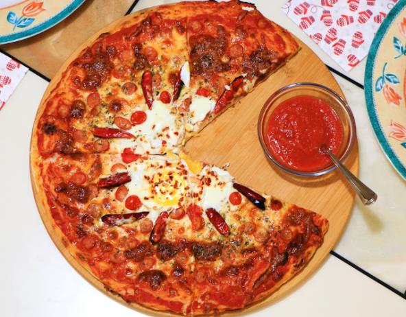 Razmutite kvasac u mlakoj vodi da nadođe. Zamesite testo. Ostavite da nadođe. Podelite na dva ili tri dela, razvucite, stavite na tepsiju pa filujte. Jaje možete odmah staviti ako volite jače pečeno, ili pred kraj da bude mekše pečeno. Gotovu picu odmah stavite u zagrejanu rernu na najaču temperaturu i pecite oko 12 - 13 minuta. Prijatno!