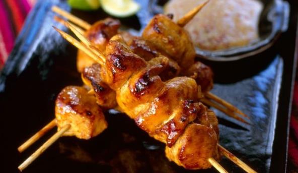 Ovaj sastojak dobro izgnječiti, dok ne postane glatka masa (Indonežani to rade na avanu). Zatim pomešati sa iseckanom piletinom i dodati meda i malo slatke soje. Začinjeno meso staviti ponovo u frižider da ostoji još oko 30 minuta. Posle ih nabadati na drvene štapiće.