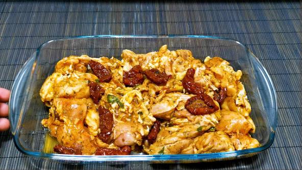 Iseći pileće batake na cetiri dela i staviti u dublji sud. Zatim dodati sve pobrojane sastojke i rukama izmešati. Poklopiti i staviti u frižider od 3 do 24 časa. Posle mariniranja poređati u neki pleh i dodati sušeni paradajz. Peći u rerni 45 min. na 190°C.
