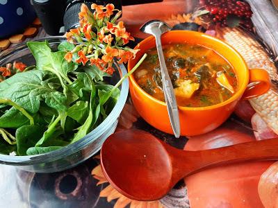 Dodati još povrća po želji i dinstati. Zatim dodati ajvar, alevu papriku, sečen na kocke krompir, mleven paradajz i sečen na krupno spanać. Dodati i lovorov list. Kuvati na tihoj vatri oko 30 min.