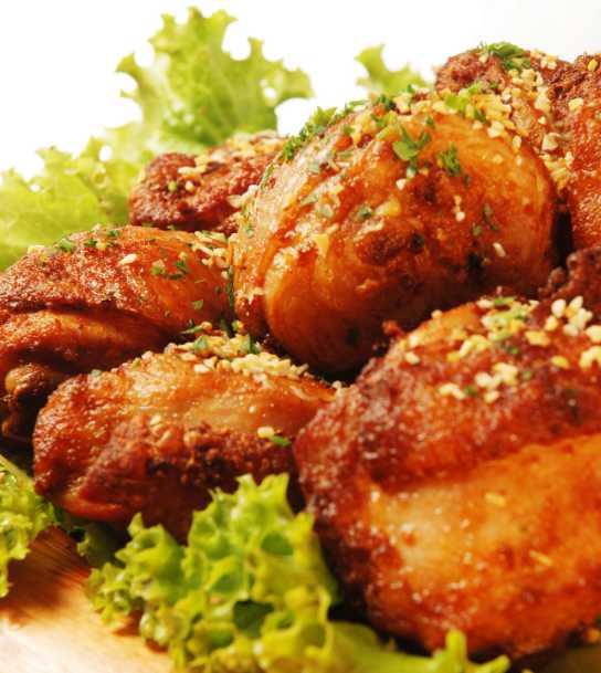 Zatim u veću posudu stavite brašno, prašak za pecivo i kari i sve dobro izmešajte. Oljuštite krompir, a zatim ga izrendajte na krupno. Pomešajte krompir sa brašnom i karijem i sjedinite lepo. Zagrejati duboki tiganj sa puno ulja. Pomešajte smesu krompira i brašna sa mariniranom piletinom i dobro sjedinite. Pržite piletinu, ali vodite računa da je svaki komad dobro obložen izrendanim krompirom. Svaku turu pržite 2 do 3 minute, zatim je okrenite i pržite dok obe strane ne budu ravnomerno pečene i hrskave. Izvadite i ocedite na ubrusu. Sitno naseckajte peršun i stavite preko piletine.