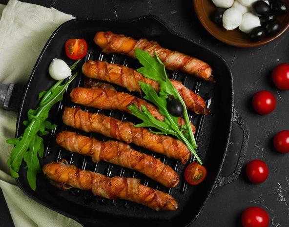Viršle ili kobasice prorežite nožem po dužini. Popunite te proreze kačkavaljem koji ste isekli po dužini. Kobasicu ili viršlu umotajte u slaninu i pričvrstite čačkalicama. Poređajte u tepsiju i pecite na 200°C. Kada se kačkavalj istopi, a slanina postane reš možete da izvadite iz rerne. Senf poslužite sa strane.
