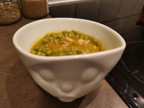 U blender stavite paradajz bez kožice, šargarepe i crveni luk, pa se to iseckajte na sitnije. U šerpu srednje veličine stavite karabatak (bez kožice i kostiju) koji ste iseckali sitno. Nalijte sa malo vode i krčkajte. Kada počne da vri dodajte ovu smesu što ste u blenderu isitnili, pa poslolite i pobiberite. Neka vam se tako dinsta neko vreme. Zatim u šerpu dodajte smrznuti grašak, nalijte sa vodom i kuvajte do željene gustine.
