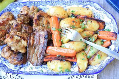 Batake i karabatake očistiti od kostiju i malo izlupati. Posoliti i pobiberit.Dodati granule belog luka, ulje i 2 kašike soja sosa i sve dobro izjednačiti.