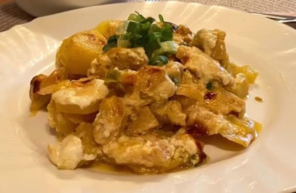 Piletinu iseckajte na krupne kockice i stavite u neku posudu. Zatim je začinite i dodajte 2 kašike senfa, pa lepo promešajte. Ako vam se ne žuri, ostavite piletinu 1-2 sata u frižideru, ali možete i odmah nastaviti sa pripremom. Malo propržite meso na ulju, pa mu dodajte mlade krompiriće koje ste isekli kao za musaku. Posle nekog vremena dodajte i mladi luk i pržite još desetak minuta. Dodajte sitno secakan čedar sir. Uzmite pleh i sve iz tiganja prespite u njega i lepo rasporedite. Zagrejte rernu na 250°C. Pospite parmezan preko i sos koji ste napravili od 250 ml pavlake za kuvanje i jedne kašike kisele pavlake. Stavite da se peče i rernu smanjite na 180°C.