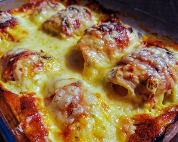Pileće grudi istucite tučkom za meso, pa poslite i pobiberite. Sitno seckani beli luk i senf pomešajte i tom smesom premažite piletinu. Stavite komade kačkavalja i urolajte. Tako pripremljeno meso uvite u slaninu i stavite u pleh. Zatim u posudi pomešajte jaja, kiselu pavlaku, pavlaku za kuvanje, mirođiju, so i biber i prelijte meso tom smesom. Pecite pola sata na 200°C. Zatim izvadite iz rerne, pospite kačkavaljem i pecite još 10 minuta.