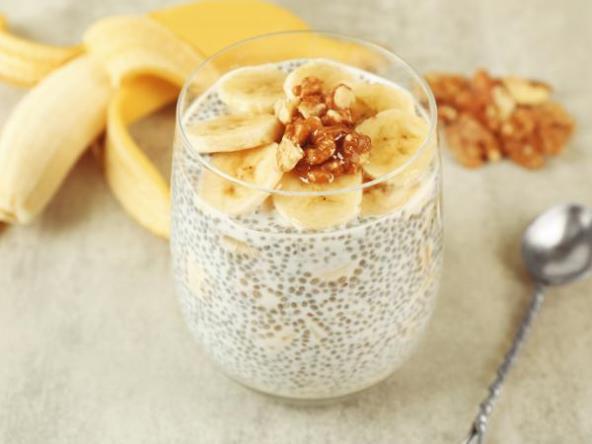 U šolju mleka dodati čia semenke. Pustiti da odstoji dvadesetak minuta (ili preko noći). Kada semenke nabubre, na vrh dodati iseckanu bananu, orahe, cimet i med.