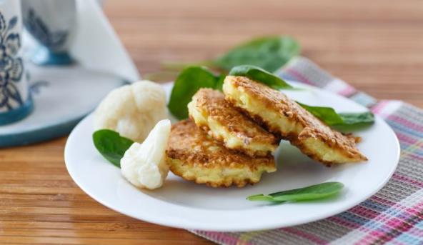 2. U posebnoj posudi pomešajte karfiol, brašno, beli luk, umućena jaja, narendan tvrdi sir, peršun, so i biber. Dodajte vodu i izmešajte sastojoke dok se ne sjedine. Smesa treba biti dovoljno gusta da se pljeskavice mogu lepo izliti (poput smese za uštipke). Pljeskavice pržite na maslinovom ulju.